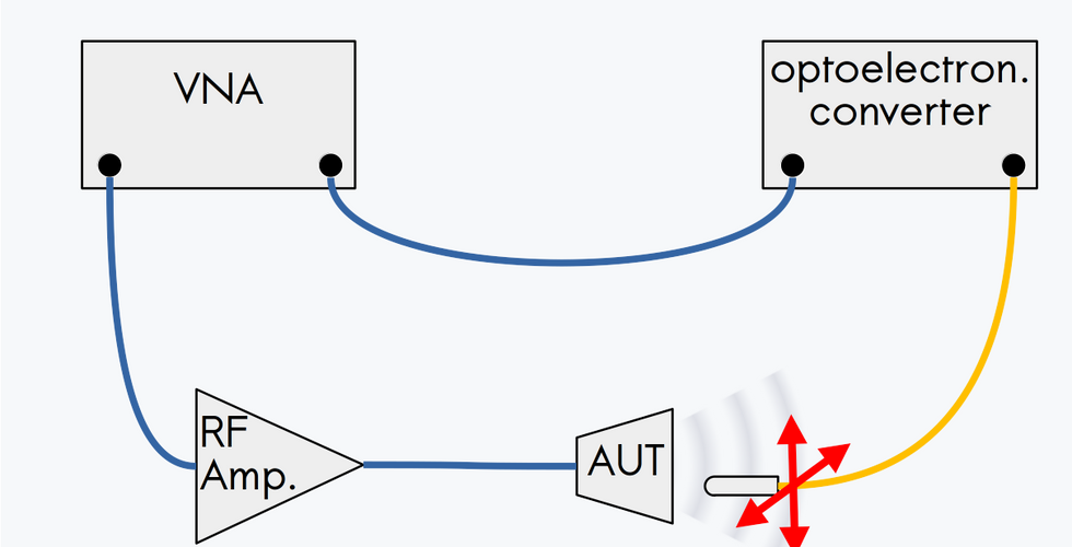 A classical antenna test range is composed of an anechoic chamber with its multi-axis antenna positioner, a vector network analyzer (VNA) and a reference antenna.